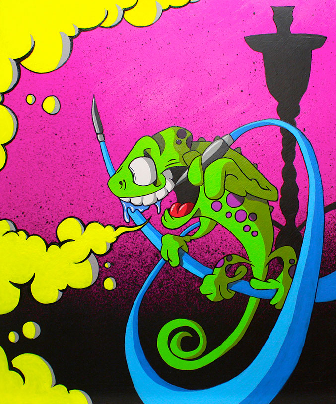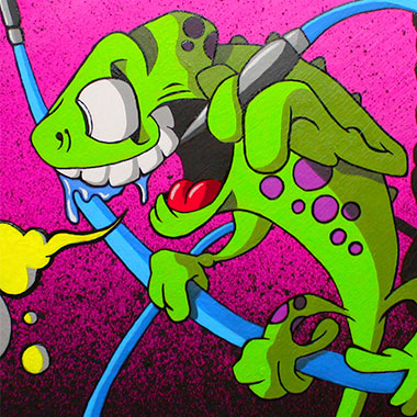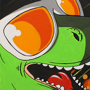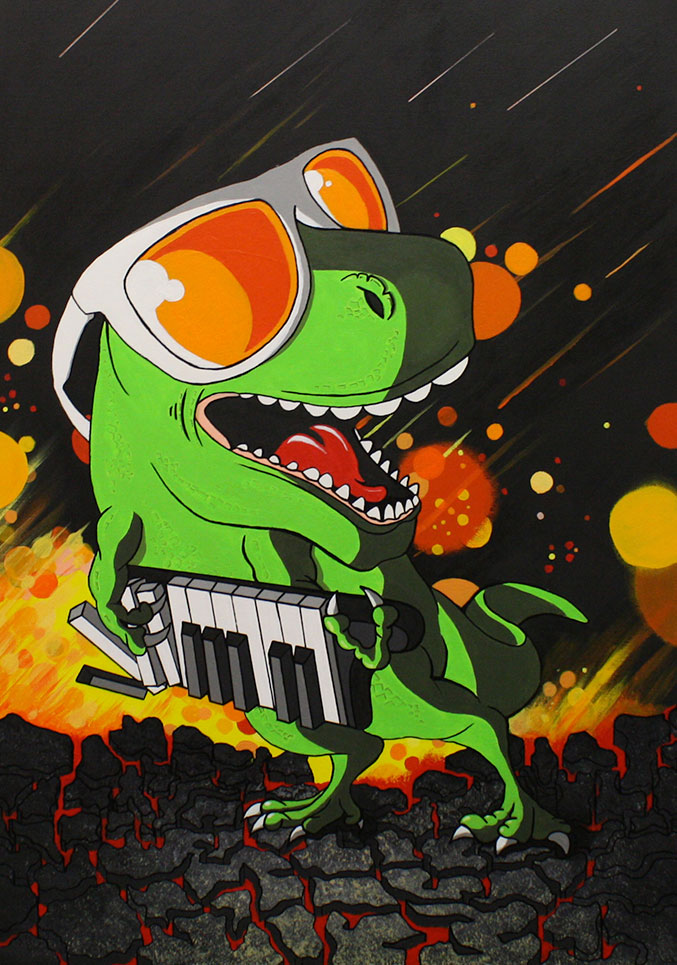 T-Rex wrecking a keytar with his short dinosaur arms.